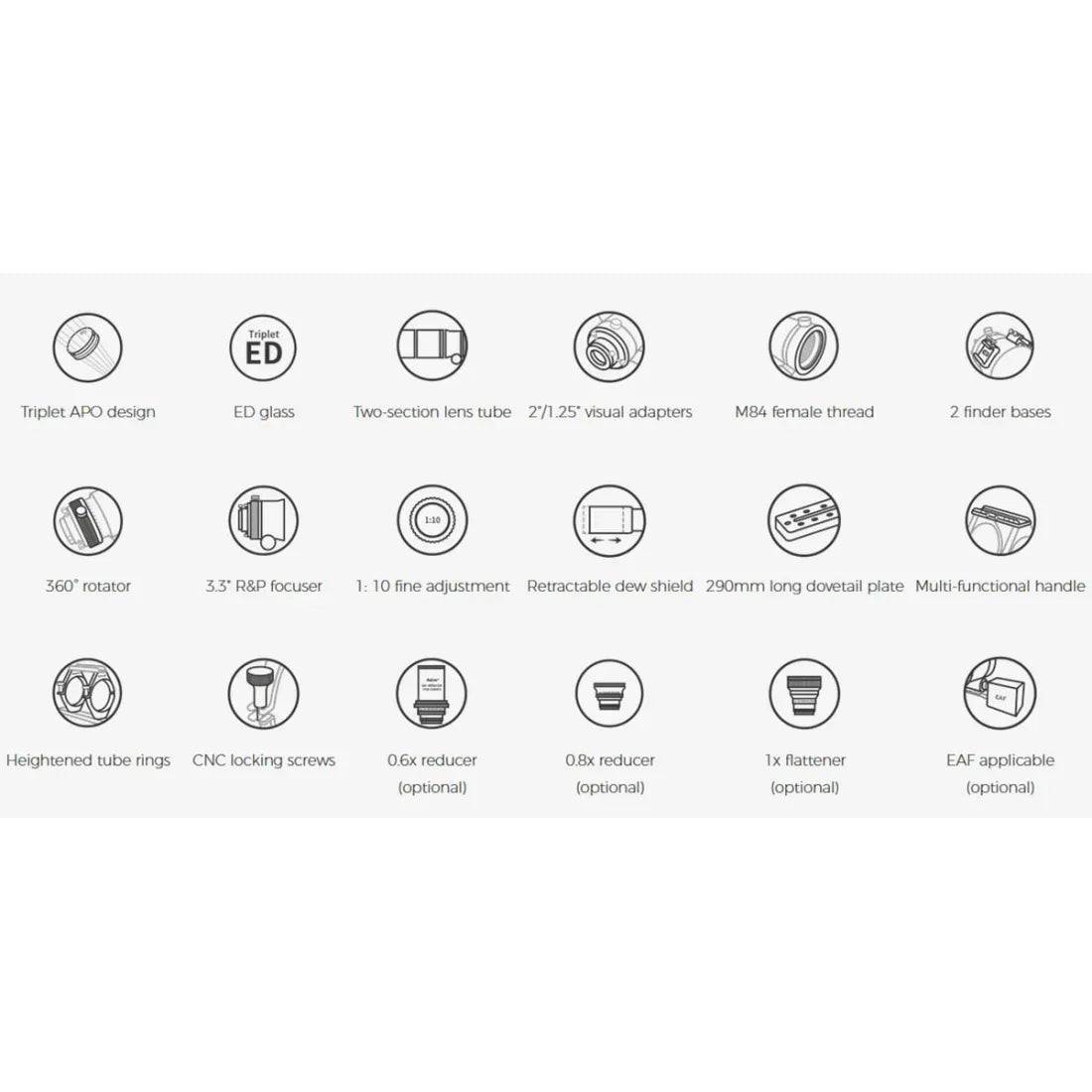 The Askar 103APO has three optional advanced accessories: a 1x flattener, a 0.8x reducer, and a 0.6x focal reducer. All three accessories have built-in 2" filter threads for direct filter installation. Additionally, they are equipped with M54/M48 adapters, and the 0.6x reducer includes an additional M68 adapter ring for convenient connections.