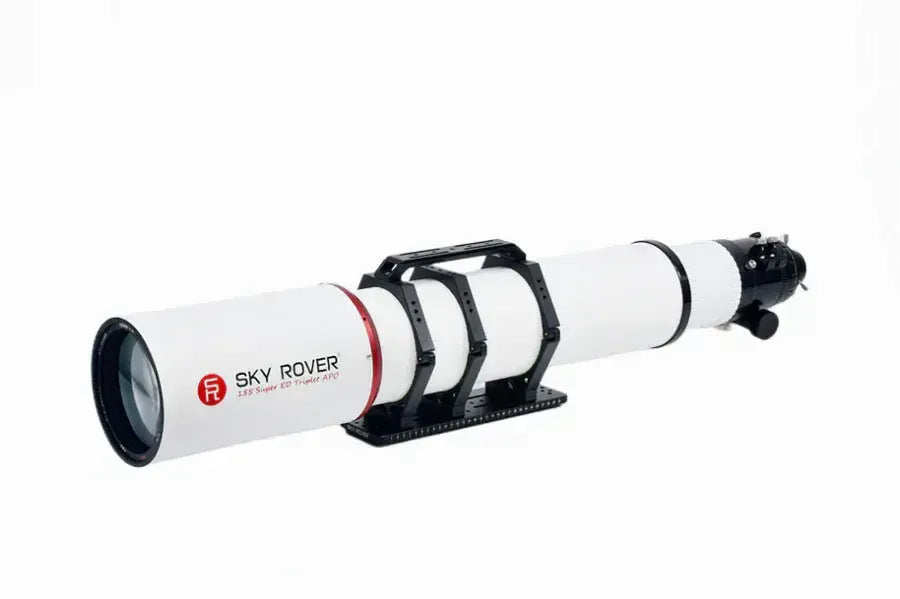 The Sky Rover 155GPS APO PRO features a 155mm aperture with triplet Super ED optics for excellent colour correction. It has three tube rings for support and balance, dual dovetail plates compatible with Losmandy & Vixen standards, and a redesigned CAA for 3.7-inch focuser stability. A detachable extension tube allows convenient binoviewer connection.