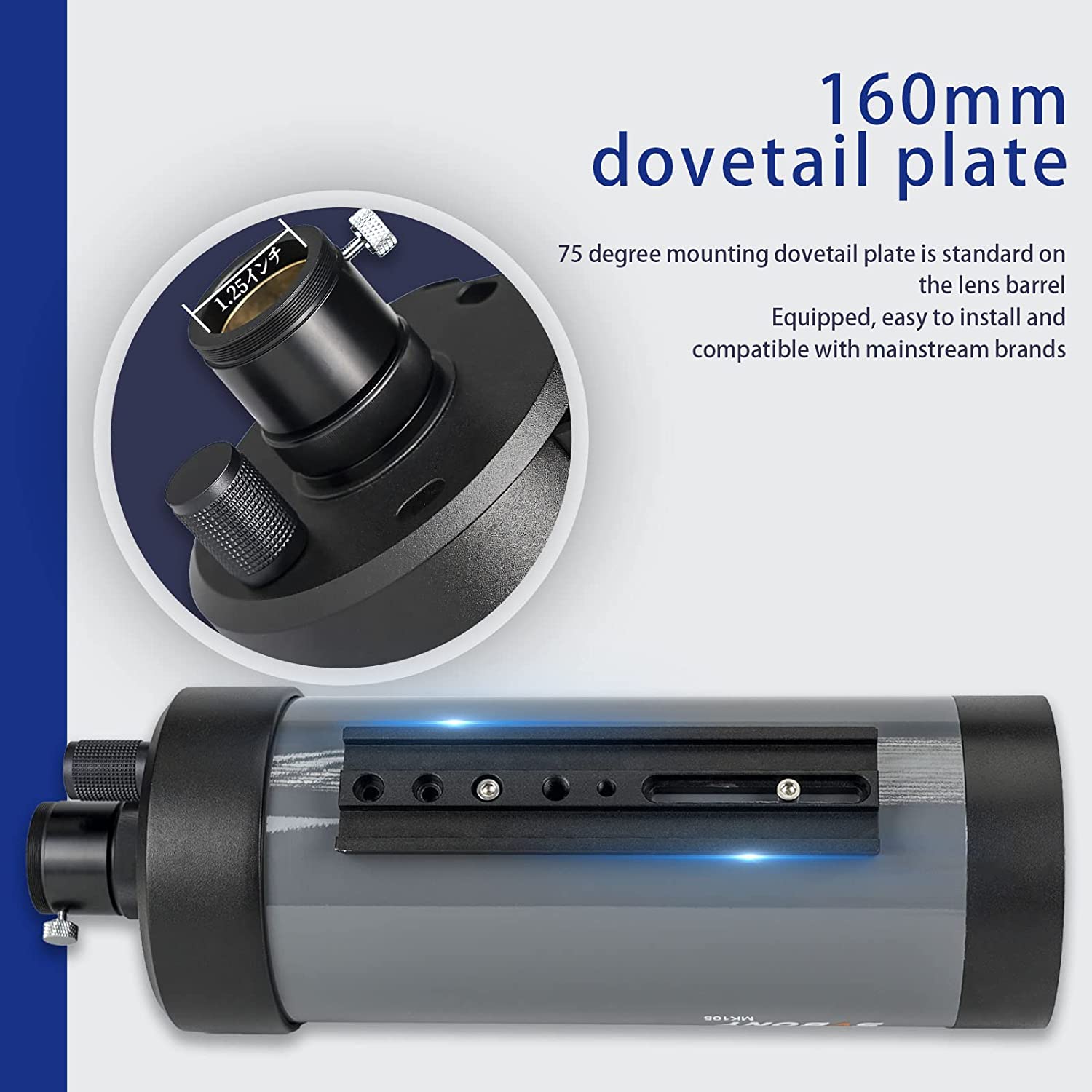 5. The barrel of the MK105 telescope adopts the design of double star-seeking bases; one built-in base and one leaky base; which is convenient for customers to connect more necessary astronomical accessories; in addition; the lens barrel is equipped with a standard 75-degree mounting dovetail plate; which is easy to install and is compatible with mainstream brand equatorial mount mounting bases